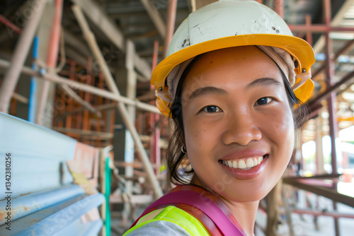 Selfie of a happy female construction foreman builder woman at a building site. Asian female apprentice scaffolder working on apprenticeship training. Inspiring young woman international women's day