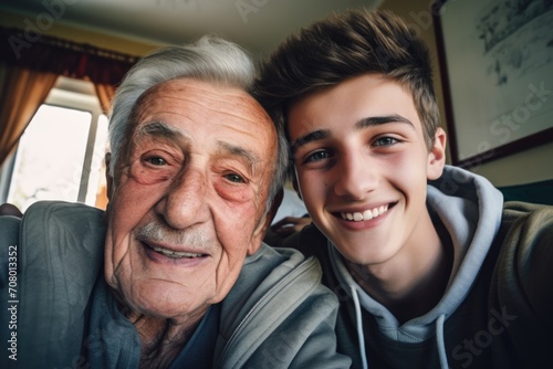 people, selfie, grandfather, grandson, smiling, home, caucasian, family, happiness, bonding, joy, generation, elderly, children, boy, senior, youth, male, man, together, human relationships, love, care, indoor, memory, affection, cheerful, kin, ancestry, bequest, portrait, casual attire, domestic, life, living, room, content, time, gap, togetherness, emotion, activity, lifestyle, copy, space