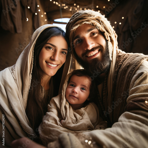 selfie style portrait of Mary and Joseph with baby Jesus. Religious Christmas nativity scene
