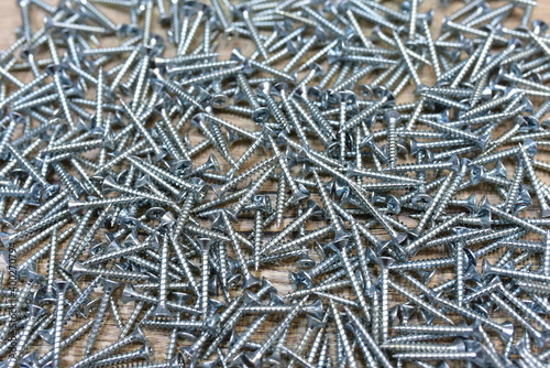 Self-tapping screw for working with wood products and surfaces. Hardware, fasteners and materials for construction and repair. Stainless steel screws background, texture