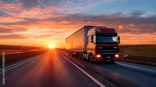 Semi truck on highway at sunset. Concept of transportation, logistics, and delivery.