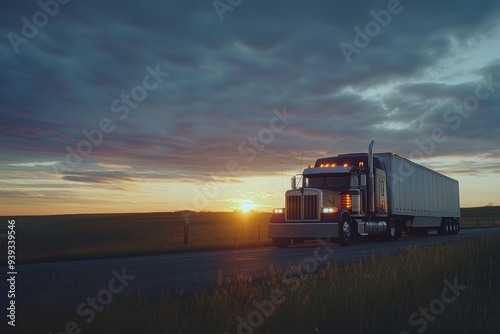 Semi truck rolling and driving through rural farmland at sunset or sunrise.