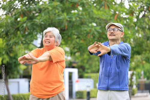Senior Asian couple stretching and exercising in a park, Happy elderly man and woman doing warm up exercises together outdoors, Mature couple staying fit and active with a morning workout in garden