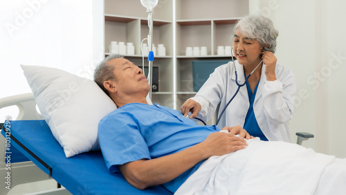 Senior Asian female doctor examining patient's health, basic procedures for general examination history taking Physical examination, gastritis, high blood pressure, medical consultant concept