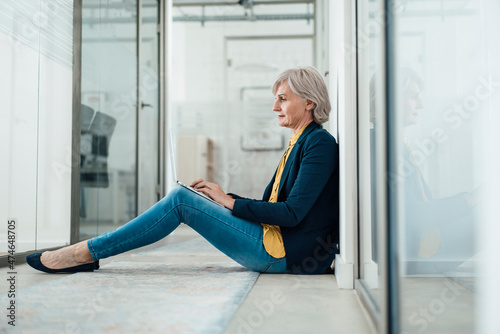 senior, businesswoman, using, laptop, floor, office, copy space, technology, 1, people, computer, communication, adult, online, business, woman, working, occupation, job, workplace, sitting, flooring, wireless, connection, cyberspace, ground, grey hair, caucasian, blazer, jacket, corridor, female