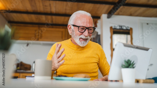 man, senior, emotion, home, technology, positive, communication, connection, one person, happy, elderly, sitting, chatting, call, aged, table, grandfather, cyberspace, adult, person, conversation, grandfather, pensioner, wireless, indoor, copy space, casual attire, grey hair, smile, gesture, use, contraption, male, looking, online, desk