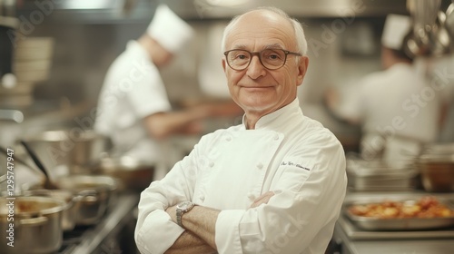 Senior chef in white uniform stands confidently in a busy restaurant kitchen surrounded by cooking staff engaged in meal preparation and culinary art