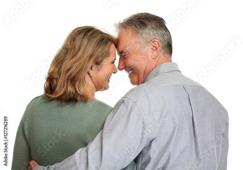 couple, senior, back, elderly, love, tenderness, smiling, portrait, woman, man, mature, happy, married, male, female, lady, loving, caucasian, people, person, old, aged, year, retired, retirement, age, old age, casual attire, lifestyle, 60, life, insurance, golden age, healthy, background, care, romantic, 2, together, pensioner, isolated, white, isolate, family, looking, each, other, lover