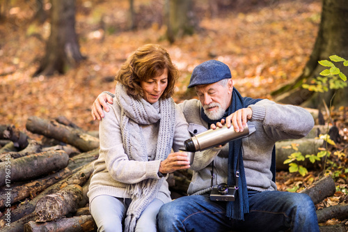 senior, senior, couple, man, woman, people, adult, 60s, old, active, love, beautiful, outdoors, outside, countryside, nature, park, forest, leaf, walking, walk, autumn, fall, light, sun, sunshine, colourful, colourful, tree, wood, timberland, flat, cap, foulard, camera, flask, thermos, drink, hot, tea, pouring, sitting, log, arm, around, shoulder, resting