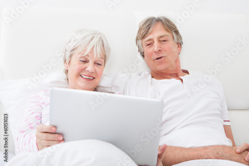 Senior Couple On Bed Looking At Laptop