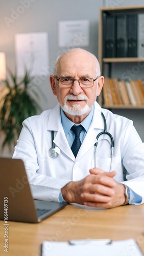 doctor, senior, medicals, professional, serious, office, laptop, stethoscope, patient, consultation, focused, confident, seated, white coat, calm, expert, trustworthy, goggles, bearded, attentive, careful, professionalism, health care, expertise, respectful, modern, clinical