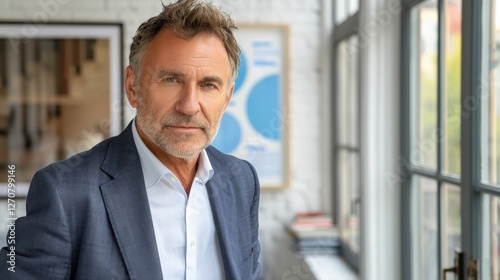 Senior executive standing in well-lit modern office, conveying experience, leadership, business confidence, corporate professional demonstrating strong decision-making strategic mindset in workplace.