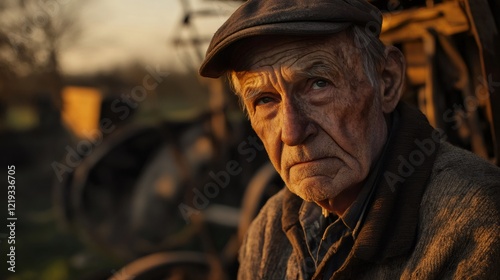 farmer, senior, old, man, portrait, sunset, tractor, agriculture, farming, rural, countryside, lifestyle, outdoors, men at work, field, farmland, age, wisdom, life events, tradition, poverty, nostalgia, wrinkle, weathered, serious, looking, gaze, cap, clothes, background, gold, hours, light, shadow, cinematic, mood, emotion, authentic, documentary