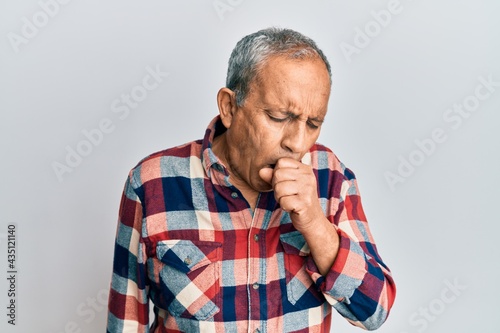 Senior hispanic man wearing casual clothes feeling unwell and coughing as symptom for cold or bronchitis. health care concept.