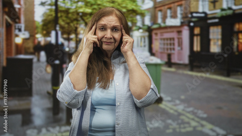 woman, forehead, touching, street, senior, elderly, hispanic, female, casual attire, blue, memory, loss, worry, forgetfulness, ageing, health, confusion, pain, care, hand, temple, shirt, hair, expression, gesture, standing, posture, wrinkle, pavement, bollard, ashbin, tree, difficulty, support, well-being, buttons, pose, mature, age, empathy, looking, face, natural, public, solitude, gaze, vulnerability