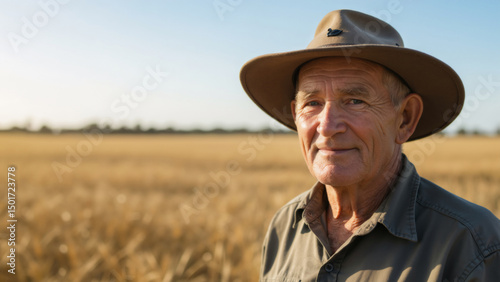 Senior male farmer in hat with black swan emblem pin standing in a golden wheat field in Western Australia. Australian agriculture and rural life portrait. Copy space for text.