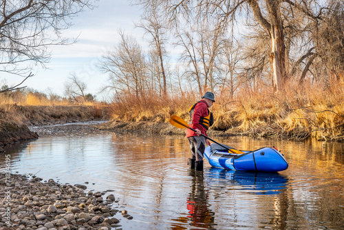 senior male paddler is launching his inflatable packraft on a river in early spring - Poudre River in northern Colorado