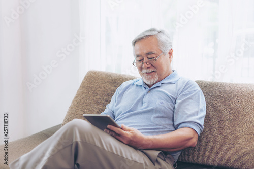 Senior Male using a smartphone , smiling feel happy on sofa at home - lifestyle senior elderly people concept