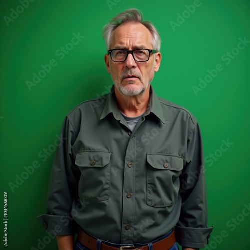 elderly, man, male, gentleman, portrait, goggles, beard, grey hair, mature, older, elder, confident, casual attire, serious, wise, green background, posing, expression, casual clothes, standing, natural look, aged, stylish, pensive, thoughtful, realistic, half-length, calm, classic, everyday, trendy, bearded, minimal, retired