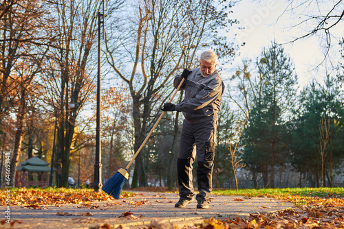 Senior male worker sweeping dry leaves with broom outdoors. Low angle view of gray haired man in overalls cleaning up sidewalk in early morning. Concept of autumn, fall season, work.