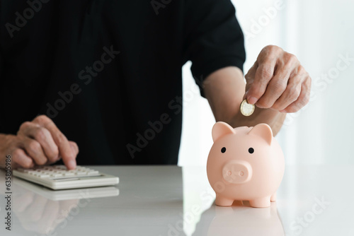 Senior man calculates and puts a coin into piggy banks with increased coins stacked on the table with a white background