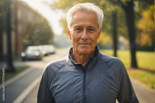 Senior man going for a run, old man living a healthy lifestyle for longevity on road in city.
