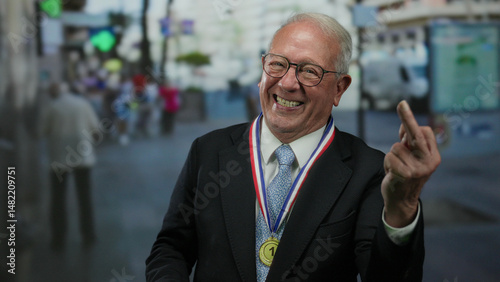 senior, man, suit, medal, gesture, street, urban, rude, humor, business, happy, funny, laughing, award, shock, surprise, expressive, emotion, winner, gold, first, place, prize, achievement, celebration, crowd, sharpened, public, scene, daylight, background, context, interaction, attire, formal, mature, expression, face, reaction, person, elderly, middle, finger, amused, miscellaneous, human, dynamic, snapshot