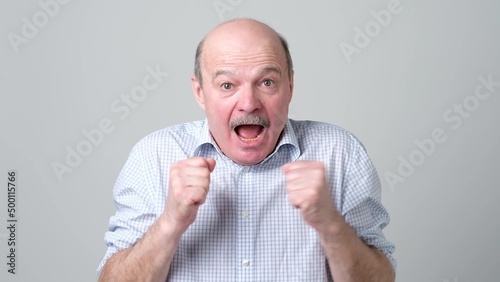 Senior man keeping clenched fists at his faces, shocked with good positive news.