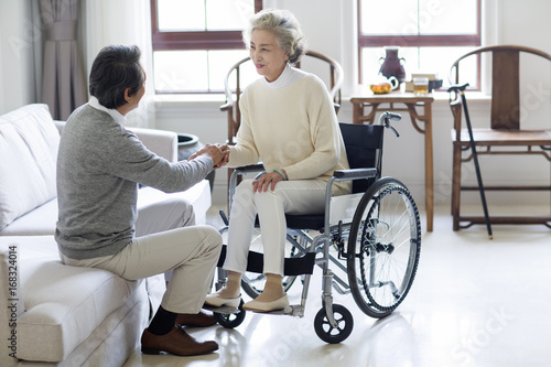 chinese, care, home, talking, wheelchair, cheerful, aging process, retirement, face to face, couple, husband, wife, people, two people, woman, female, man, male, asian ethnicity, asian, adult, adults only, fragility, special needs, paralysis, disabled, disability, patient, close to, enjoyment, happiness, joy, leisure, lifestyle, togetherness, white hair, grey hair, casual clothes, furniture, chair, holding hands, sofa, day, serene people, indoor, window, home interior, looking away, sitting, smiling, toothy smile, china, east asia, asia, beijing, photo, color image, front view, selective focus, full-length, horizontal