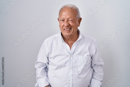 Senior man with grey hair standing over isolated background winking looking at the camera with sexy expression, cheerful and happy face.