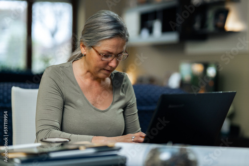 Senior mature older woman watching business training, online seminar on laptop computer remote working