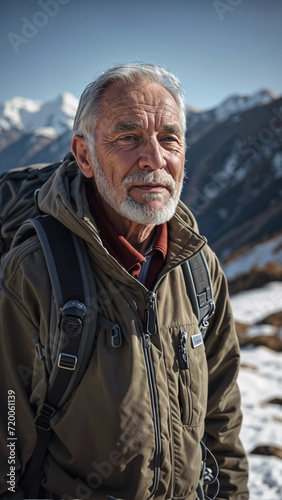 senior, person, old, man, trekking, vacation, trip, walking, adventure, hiking, healthy, corona, people, winter, outing, outdoors, jacket, looking, mature, grandfather, 1, high, hill, snow