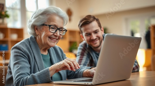 Senior Woman and Young Man Engaged in Online Learning Together at a Bright and Cozy Home Office