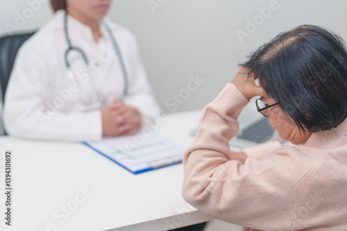 Senior Woman having headache and consulting doctor to disease. Elderly health patient, Medical Diagnosis, Migraine, Brain Tumor, Brain Stroke, Dementia, neurological disorder, alzheimer, Parkinson