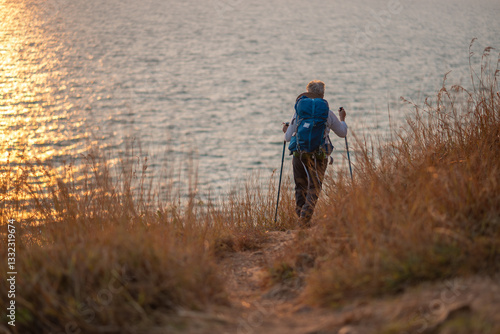 Senior woman is hiking outdoors, enjoying nature expression looks into the distance observing and possibly guide trekking and trail ecotourism adventure concept.