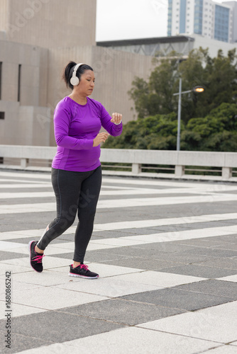people, jogging, running, fitness, activity, urban, recreation, wellness, senior, woman, hispanic, copy space, athletic, earphones, wristwatch, purple, long sleeve, leggings, running shoe, city, piazza, concrete, tiled, pavement, modern, building, greenery, tree, cloudy, sport, exercise, health, casual attire, focused, profile, lifestyle, motion, endurance, active, energy, faceless, solitary, pedestrian, single, daylight, casual clothes