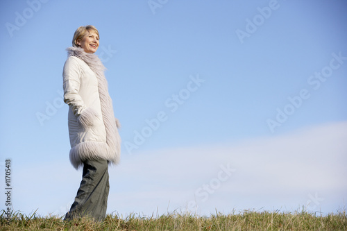 winter, woman, happy, park, cheerful, cold, outdoors, portrait, smiling, warm clothes, winterly, senior, adult, 60s, casual clothes, caucasian, copy space, day, one person, season, 60s, standing, horizontal, person, people, fall, autumn, countryside, chilly, cosy, warm