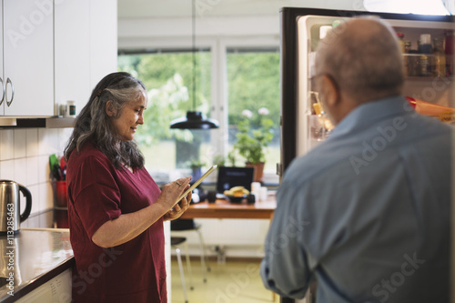 woman, couple, man, senior, caucasian, use, technology, kitchen, hold, refrigerator, 2, people, pair, indoor, wireless