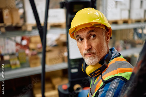Senior worker operating forklift in reverse while loading cargo in warehouse.