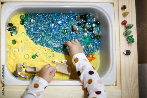 Sensory development box, sea theme with sand and stones, development of fine motor skills in children, close-up toys in touch table