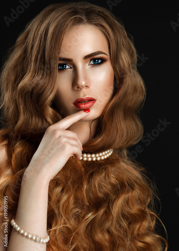 necklace, lipstick, red, lip, shiny, healthy, elegance, woman, girl, female, elegant, long hair, sensuality, posing, caucasian, beauty, background, isolated, young, portrait, hair, face, fashion, black, person, model, people, human, pretty, studio, glamour, coiffure, sexy, adult, attractive, beautiful, style, salon, make-up, long, gold, curly, lady, luxury, closeup, brown, skin, honed, smooth, gorgeous