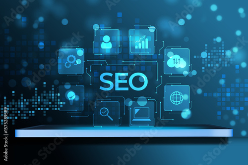 SEO Search Engine Optimization Visualization concept on tablet Background