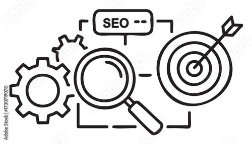 strategy, icon, target, magnifying, glasses, gear, arrow, illustration, optimization, search, engine, marketing, digital, web, targeting, precision, sharpened, design, concept, iconography, datum, success, business, aim, goal, technology, identification, research, improvement, analysis, element, symbol, linear