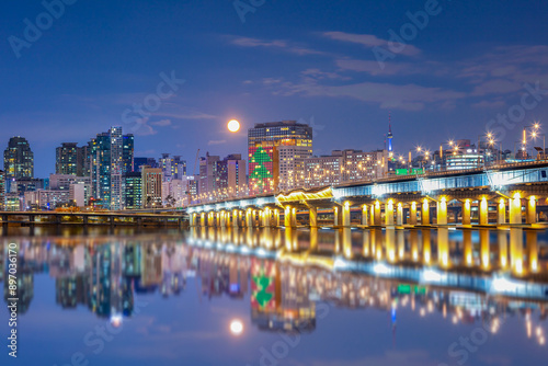 Seoul City at night with Full moon South Korea