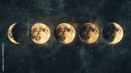 Sequence of Five Different Phases of the Moon Showing Lunar Cycle Including New Moon Waxing Crescent First Quarter Full Moon and Waning Gibbous Against Dark Night Sky