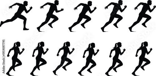 Sequence of male and female running silhouettes in black isolated on white background for animation sprite sheet and sports fitness graphic design projects