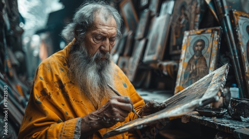 Serbian Orthodox monk painting religious icons in a quiet monastery overlooking the Balkans