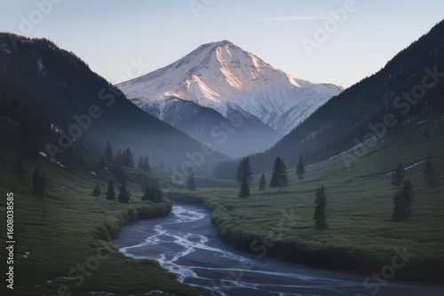 Serene Alpine Landscape with Winding River and Snow-Capped Mountain Peak