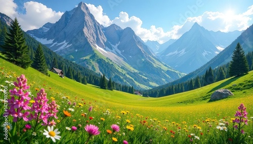 Serene alpine meadow nestled among towering peaks, wildflowers in bloom , alpine meadow, mountain meadow, nature