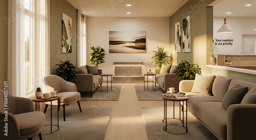 waiting room, interior, design, furniture, modern, comfortable, serene, calm, relaxation, health care, hospitality, lobby, reception, area, space, seating, decor, plant, art, lighting, sunlight, airy, bright, contemporary, style, elegant, neutral, tone, texture, cushion, pillow, table, mag, hot drink, cup, potted, artwork, window, light, calmness, minimalist, clean, fresh, inviting, welcoming, peaceful, harmony, balance, beauty